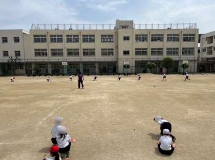 2年生は体育の学習です。走りながら、途中にあるマーカーコーンをタッチします。友だちと競走すると、とても楽しいです。