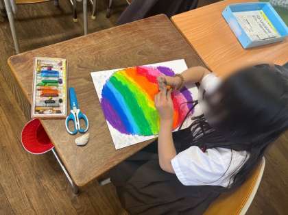 2年生は図工の学習です。「ふしぎなたまご」という作品を制作しています。今日はパスを使って、たまごを描きました。とても上手に描いていますね!