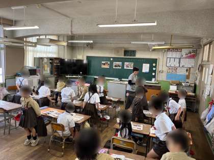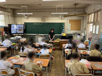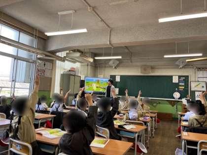 1年生は算数の学習です。絵を見ながら何番目かを考えます。先生が「ブタさんは何番目ですか?」と発問すると、たくさん手が挙がりました。理由も説明できてとても素晴らしかったです。