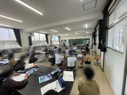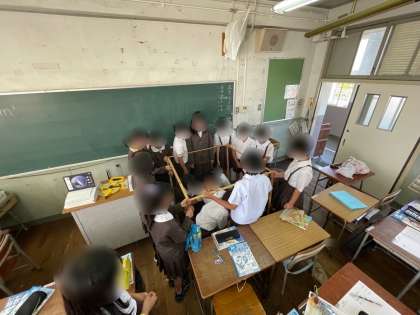 5年生は、算数の学習です。1㎥がどれくらいの大きさか体感するために、1mものさしを組み合わせて、みんなで1㎥の立方体を作ってみました。中に何人くらい入れるかも試してみました。思ったより入れたね。