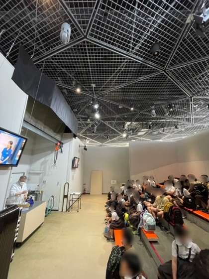 最後に、サイエンスショーを観覧しました。今日のテーマは、「空気の力」についての実験です。目の前で実験をしてくれるので、子どもたちは興味津津です。とても楽しく学ぶことができました。