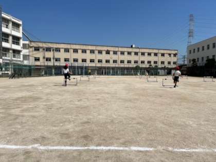 6年生は体育の学習です。前回では学習端末を使って自分の姿を確認しましたが、今回はハードルの間隔を変えながら、ハードルをまたぎやすいステップを探究しました。