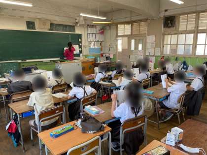 2年生も国語科の「外国の小学校について聞こう」という単元の学習です。聞きたいことを落とさずに聞く力を養うことが目標です。この時間は、話の内容を読み取るために、みんなで音読に取り組みました。
