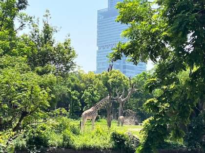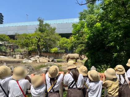 動物園の見学のはじまりです。テレビや図鑑などで知っている動物ですが、実際に見るとやっぱり迫力が違いますね。自然と子どもから歓声が上がりました。ハルカスがある都会にキリンがいるなんて不思議ですね。色々な動物を観察することができました。