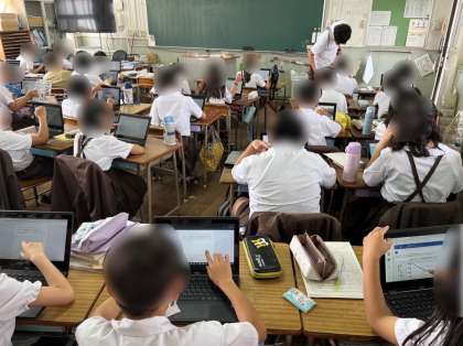 5年生は学級活動の時間です。学校生活について、学習端末を使って回答しました。端末操作もとても上手にできています。