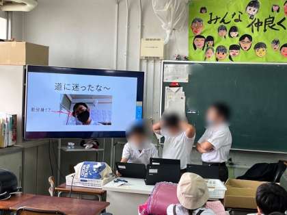 4年生は総合学習の時間です。プレゼン係が作ったおもしろプレゼンを皆で視聴した後、プログラミングソフトを使って、プログラミングの練習をしました。