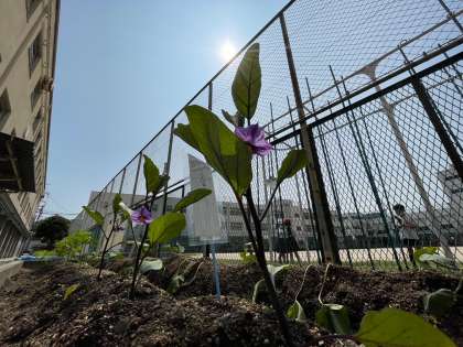 朝会後、ふと見ると、2年生の学習園に植えているナスが、紫色のきれいな花を咲かせているのに気づきました。季節は少しずつ夏に向かっています。体調に気をつけて元気に過ごしていきたいですね。