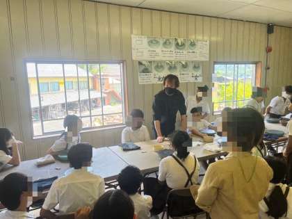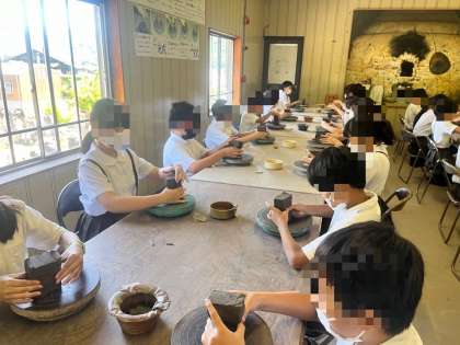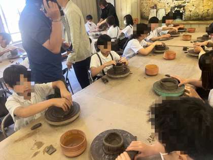 予定通りに、宗陶苑に到着。第一の活動、陶芸体験の始まりです。説明を真剣に聞いて、ろくろを回したり、粘土をこねたりしながら、頑張っています。