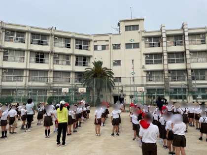 今日は天候が良いので、運動場で児童朝会を行いました。校長先生からは、様々な自治体の特色ある条例の紹介から「きまり」についてのお話がありました。また、看護当番の先生からは、集団登校で並んで登校できていたことや、気持ちの良いがあいさつができていたことが良かったとお話がありました。