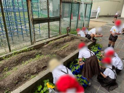 朝会が終了した後、学習園でアサガオに水やりをする1年生の姿が。「見て!こんなに大っきくなったよ。」「ぼくも見てー。」「わたしも見てー。」みんなすくすくと生長するアサガオを見て嬉しそう。大切に、大切に育てようね。