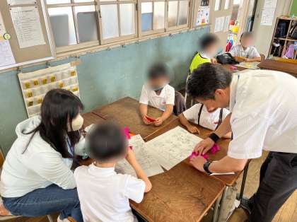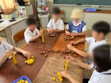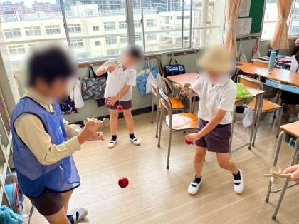 今年のデンリンピックは、「お手玉」「折り紙」「けん玉」「積み木」の4種目です。各教室に移動してルールの説明を聞いてからそれぞれの種目に挑戦しました。技の難易度に応じてレベルが決められているので、低学年の児童も、高学年の児童もそれぞれに応じたレベルに挑戦できます。