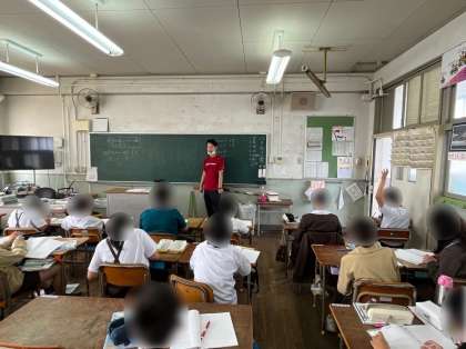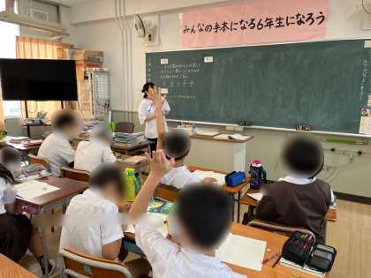 6年生は算数の学習です。分数同士をかけあわせて1になるのはどんなときかについて考えています。3分の2なら2分の3をかけると1になります。このとき2分の3は3分の2の逆数であるということも学びました。