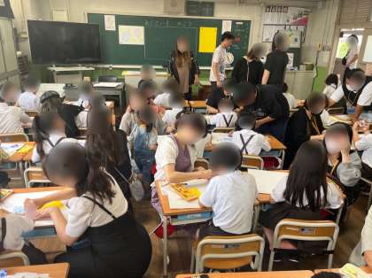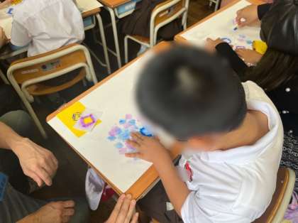 図工の参観です。「あじさいをかこう」という学習で、おうちの人にも手伝ってもらい、パスを使ってあじさいの淡い色を描きました。