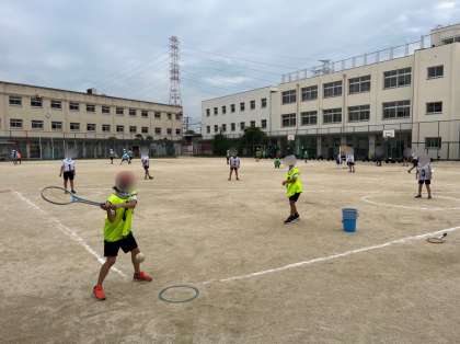 4年生は体育の学習です。ベースボール型ゲームも少しずつ動き方やルールがわかってきました。今日はミニゲームを体験しながら、試合の流れについて感覚をつかみました。ラケットにあたったボールが遠くへとぶと歓声があがりました。