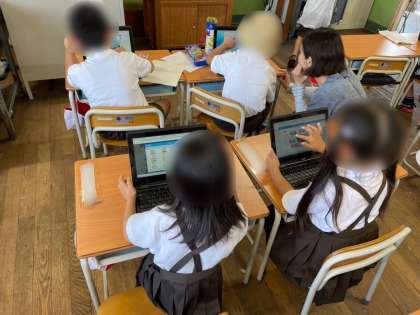 1年生は、学習者用端末に入っているプログラミング用ソフト「ビスケット」を使って簡単なプログラミングに取り組んでいました。