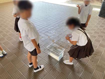 2年生は、算数でした。「水のかさのたんい」の学習で量感をつかむため、実際にリットルますを使って、水槽にどれくらい水が入るか確かめました。