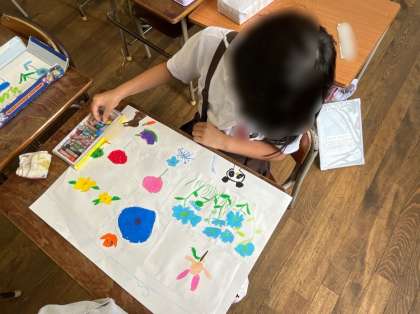 2年生は図工の学習です。「おはなスケッチ」という作品を制作しています。学校や身近なところで見たお花をスケッチしてパスで描きました。それらを生き物と一緒に画用紙に貼り付けていきました。
