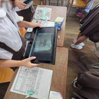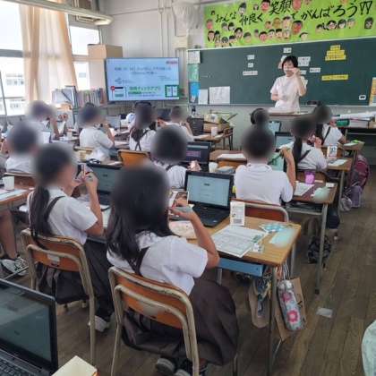 歯科医師、歯科衛生士の先生が来てくださって、4年生にフッ化物洗口を実施しました。フッ化物洗口とは、フッ化物を含んだ液体でうがいをして、虫歯になりにくい歯にすることです。洗口と同時に歯科衛生士から歯磨き指導もしてくださりました。最後に、ガムのようなものを噛み、その画像を専用のサイトに送信して自分の嚙む力を調べました。
