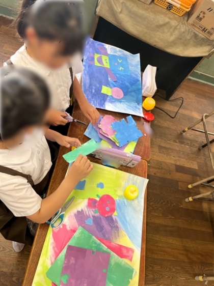 3年生は図工の学習です。「はりえ de ロボット」という作品を制作しています。友だちの相談しながら、いろいろな色を塗った紙を切り貼りして、作品を作っていきました。