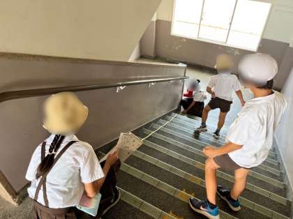 3年1組は算数の学習です。グループに分かれて、まきじゃくを使って色々な長さを測りました。運動場や教室、階段などの長さを測ることで、長さについての理解が深まりました。