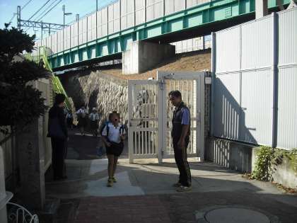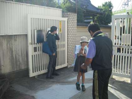 あいさつ、服装、集団登校のがんばっている様子を先生たちみんなで見守っています。