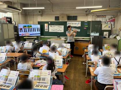1年生は音楽の学習です。鍵盤ハーモニカを使ってドレミファソの場所を確かめていきました。まず、指で鍵盤の場所を確かめてから、実際に息を吹いて音を出していきました。その後、先生が出した音と同じ音の鍵盤を押すゲームをしました。