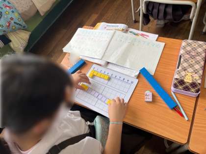 1年生は算数の学習です。「10といくつになるか」について、考えました。計算をする前に、実際にブロックを並べて数を数えました。具体物で確かめると、数をイメージしやすくなりますね。