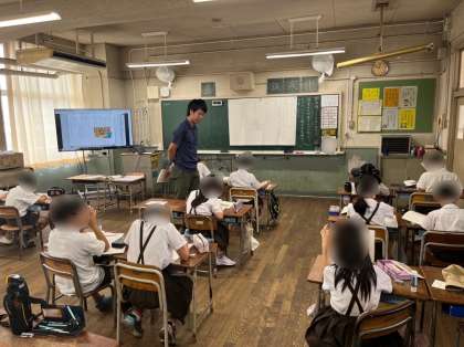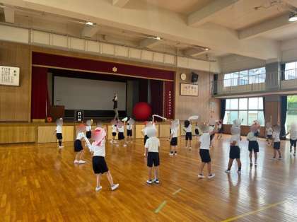 2年生は体育の学習です。表現・リズム運動もかなり進み、長いフレーズを踊れるようになってきました。今日は二つのグループで動きをずらす練習をしました。最後に、一緒に踊ると、動きが違うことで、躍動感が生まれていました。