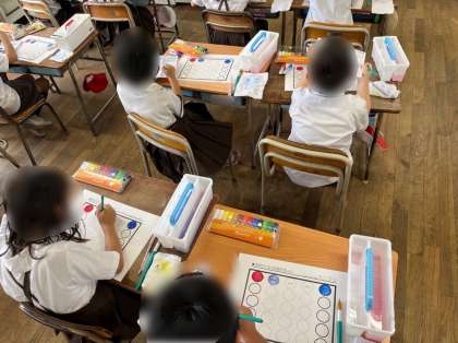 2年生は図工の学習です。2色の色を混ぜて、色をつくる練習をしました。練習用の紙に青色を付けていくと、「宇宙みたい!」「きれい!」という声があがりました。