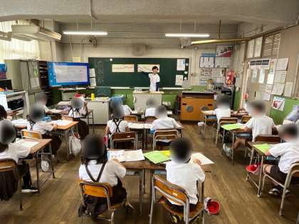 2年生は音楽の学習です。音の高さ(旋律)に気をつけながら歌う練習をしています。音の高さに歌詞を合わせた図を指でなぞりながら歌いました。高いところは手をあげたり、低いところは下ろしたりして旋律をより感じることができました。