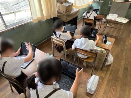 3年生は総合学習の時間です。ICT支援員さんの協力のもと、描画キャンパスというソフトを使って絵を描きました。学習端末を使って描画する利点は、やり直しが簡単なことと色々な色で描けることです。子どもたちは、端末を駆使して素敵な作品を描きました。