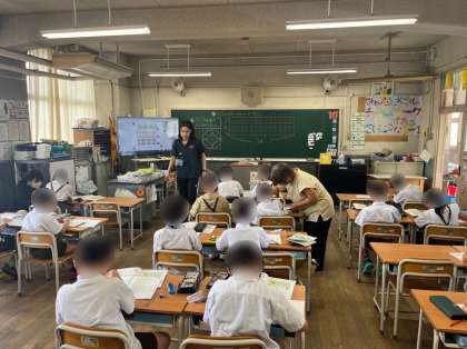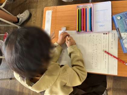 1年生は国語の学習です。昨日から引き続き物語文「サラダでげんき」について、りっちゃんにサラダにいれるといいものを手紙に書いて教えてあげました。コーンやピーマンなど色々なアイデアを出ました。