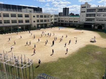 2年生は体育でボール運動の学習です。ペアでキャッチボールをした後、まとあてゲームをしました。的を当てる人、守る人に分かれてゲームをしました。守りをかいくぐってボールが的に当たると大きな歓声があがりました。