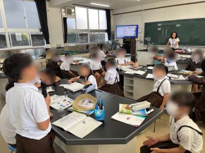 4年生は理科の学習です。「温度とものの変化」について、水を入れた注射器を押す実験をしました。実験の後、グループごとで考察を交流すると、「水は押しても、体積が変わらない」ということが確かめられました。