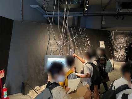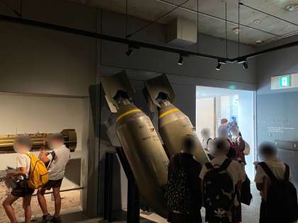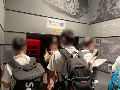 1階のフロアは、大阪空襲の展示です。1トン爆弾の模型や防空壕の疑似体験など、様々な展示物があります。当時の写真パネルを見ながら、みんな真剣にメモをとっています。