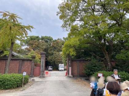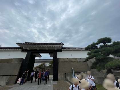 お弁当の後は、大阪城公園内の戦跡めぐりです。大手門をくぐって、大阪陸軍兵器支廠本部門(現在の大阪城公城内詰所)です。