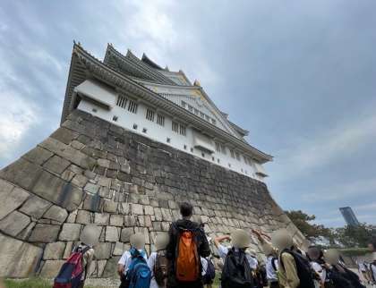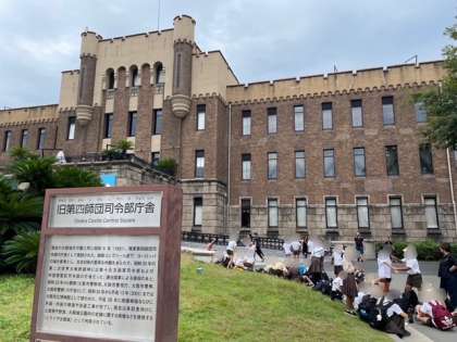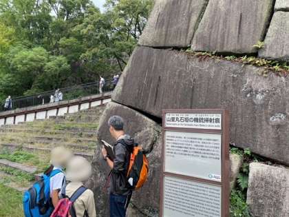 旧第四師団司令部庁舎(現在のミライザ大阪城)を見て、大阪城天守閣の爆撃被害跡で、ずれた石垣を見つけました。また、機銃掃射跡も見学しました。こんなに身近なところに戦争の爪跡が残されていたんですね。