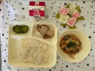 今日の給食では、さといも、れんこん、しめじを使っています。