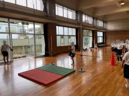 4年生は、体育で「走り高跳び」に取り組んでいます。助走のリズムや振り上げ足、踏み切り足を意識して、何回もチャレンジしました。