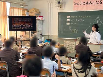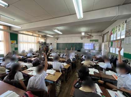 6年生は音楽の学習です。ハンガリー舞曲第5番を鑑賞しながら、曲想の移り変わりについて、指揮の真似をしながら聴きました。実際に体を動かしながら聴いてみると、曲の速さや音の強さがあることで曲想が移り変わることがわかりました。