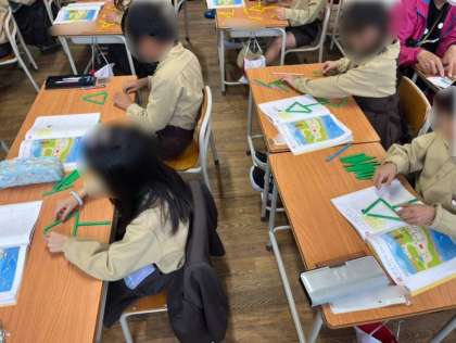 1年生は算数で「かたちづくり」の学習をしています。教科書にあるお手本と同じ形を数え棒を使ってつくりました。一つできると、どんどん他の形にも挑戦しました。
