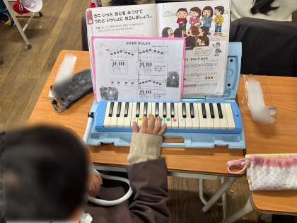 1年生は音楽の学習です。気に入った音を見つけて歌と一緒に鳴らします。「かえるのがっしょう」の曲を3つのグループに分けて鍵盤ハーモニカで演奏しました。練習を重ねるごとに指づかいが上手になっています。
