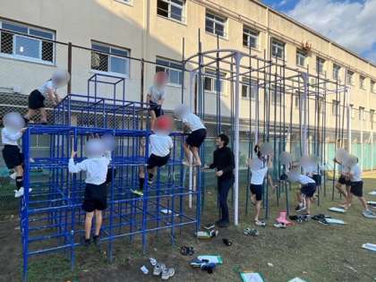 3年生は体育の学習です。「からだつくりチャレンジタイム」と題して、運動場の色々な遊具や一輪車等を使って新しい動きを習得していきます。ワークシートの動きを真似しながら、色々な動きに挑戦していきました。