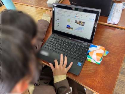 4年生は社会の学習です。これまで都道府県について調べたことをプレゼンテーションのソフトを使ってまとめてきました。今日はICT支援員さんも来てくれ、ソフトの効果的な使い方を教わりながら、改良を加えました。