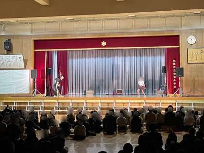 今年度の芸術鑑賞会は、パフォーマンスカンパニー「to R mansion(トゥアールマンション)」さんに来ていただきました。身体と小道具を使った様々なパフォーマンスに子どもたちは大歓声。講堂は大きな笑い声に包まれました。代表で選ばれた子が舞台で一緒にパフォーマンスをしたり、全員でパントマイムの練習をしたりとあっという間の1時間でした。