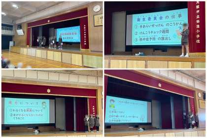 今週の児童集会は、衛生委員会による発表でした。「衛生委員会の仕事」、「視力について」、学校医の石見先生による「健康で過ごすためにこれから気をつけること」、の3つについて丁寧に説明してくれました。これを機に、子どもたちの健康への意識が高まると嬉しいですね。