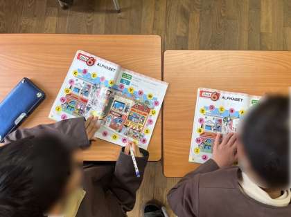 3年生は外国語活動の時間です。今日のテーマはアルファベット。英語には大文字と小文字があります。イラストを見ながら大文字、小文字を見つける練習をしました。