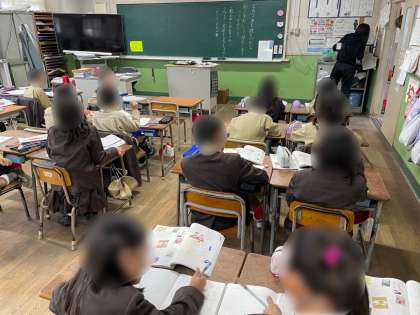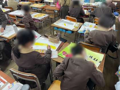 4年生は図工の学習です。物語文「ごんぎつね」で思い出に残った場面を描いています。色の違うパスで上塗りすると、ぐっと絵に深みが出ました。