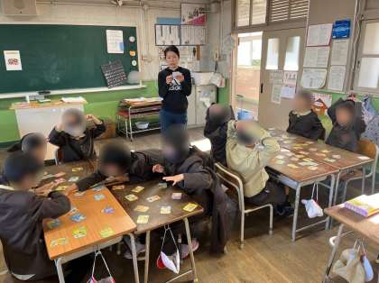 2年生は国語の学習です。グループで昔話のかるたをしました。先生が「ももから生まれたももたろう」と読み上げると、子ども達はその言葉に合った札を探しました。教室に「はい!」と言葉が響き、とても盛り上がっていました。
