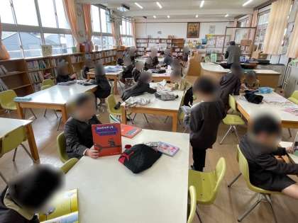 1年生は、図書室で読書の時間でした。自分の好きな本を手にとって、一人でじっくりと読んだり、一つの本を友だちと一緒に楽しみながら読んだりして過ごしました。